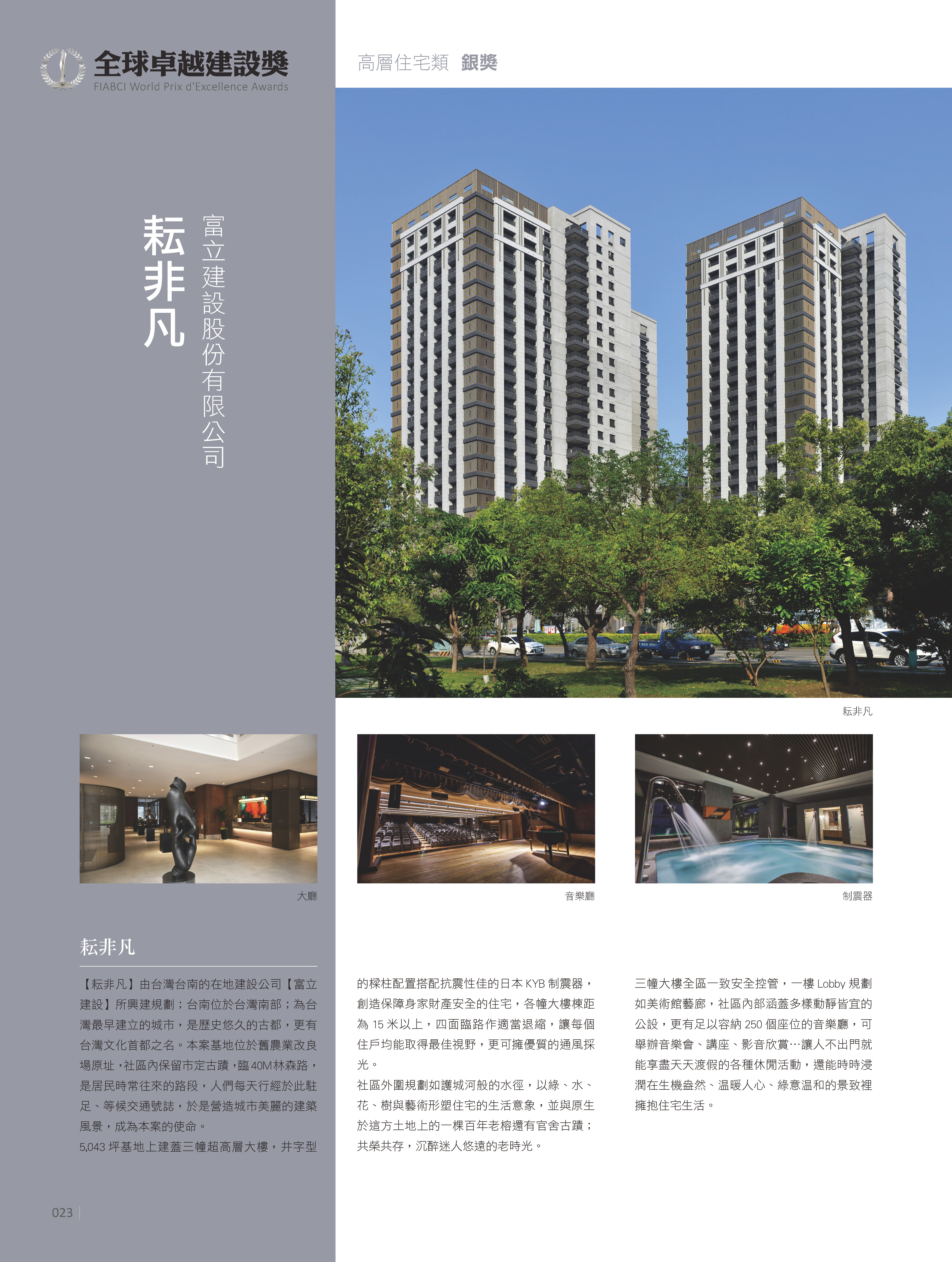 世界不動產聯合會(FIABCI)舉辦之「全球卓越建設獎」(FIABCI World Prix d’Excellence Awards),主旨為肯定具創新的最佳卓越建設作品。它展現世界不動產聯合會具體理想的建築典範,提供社會大眾對於房地產要求的最佳指標。此獎項是來自國際頂尖的房地產專業人士和專家共同評審與鑑定,其評選標準是以美觀、功能性及全方位性做為考量。